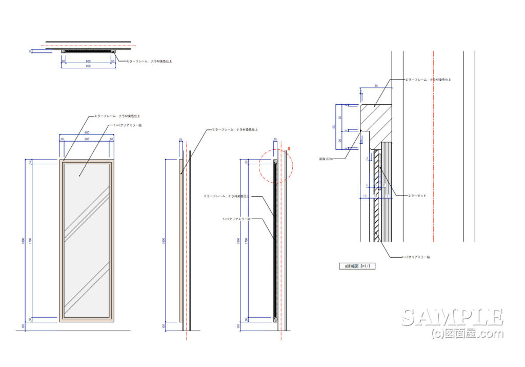簡単な図面ですが、このミラーパネルを壁面に如何に取り付けるかがポイントです。