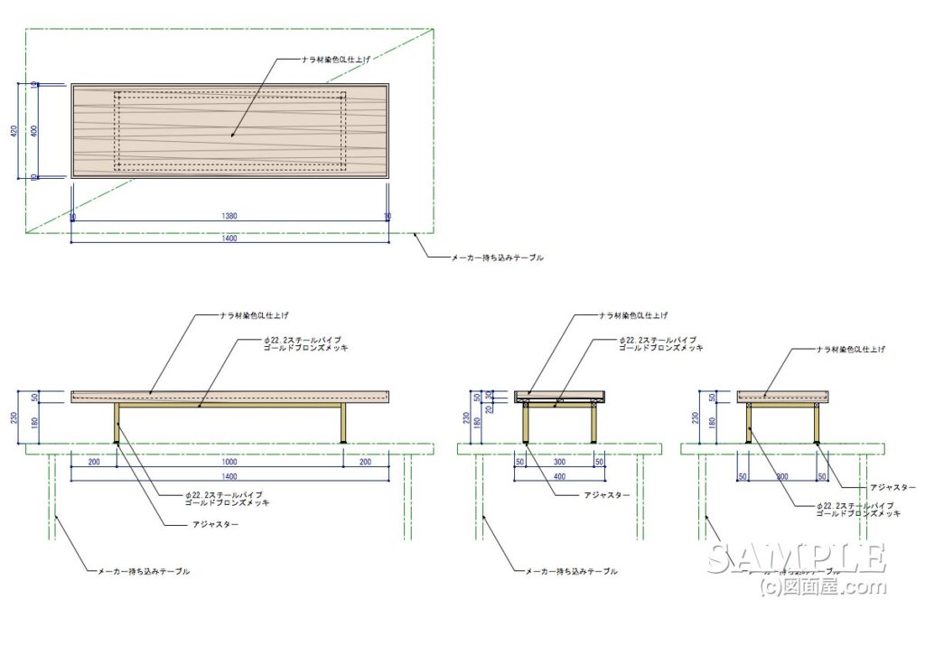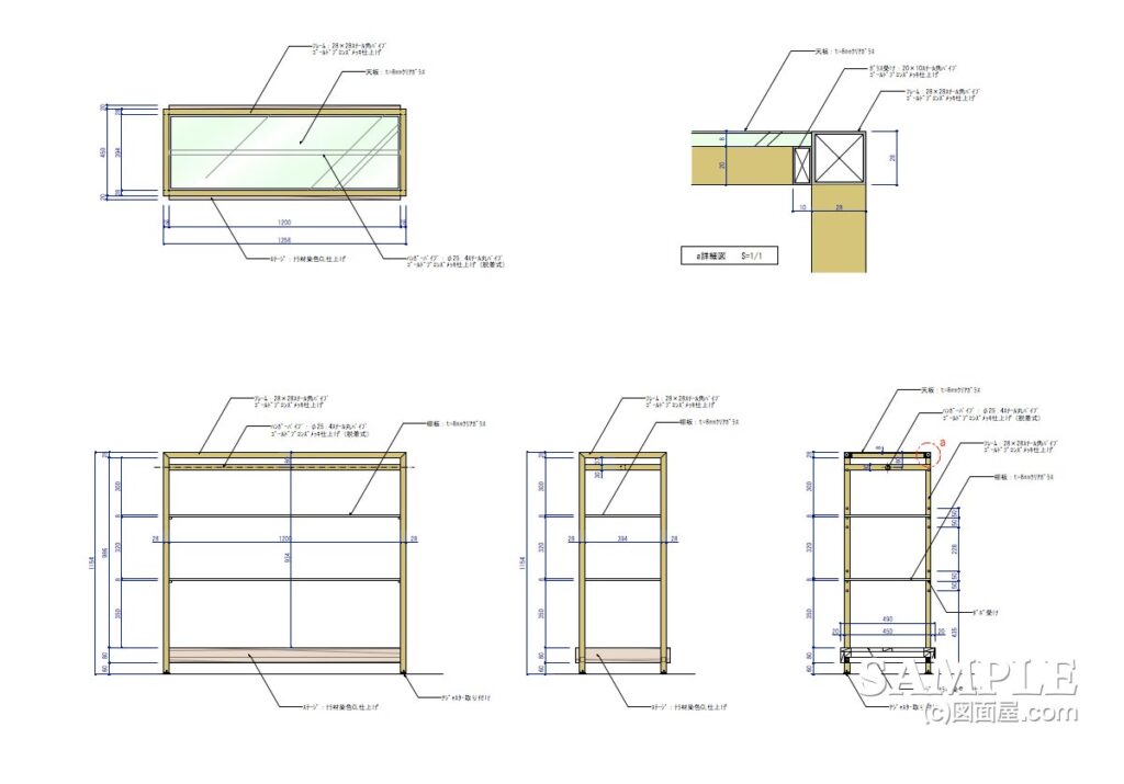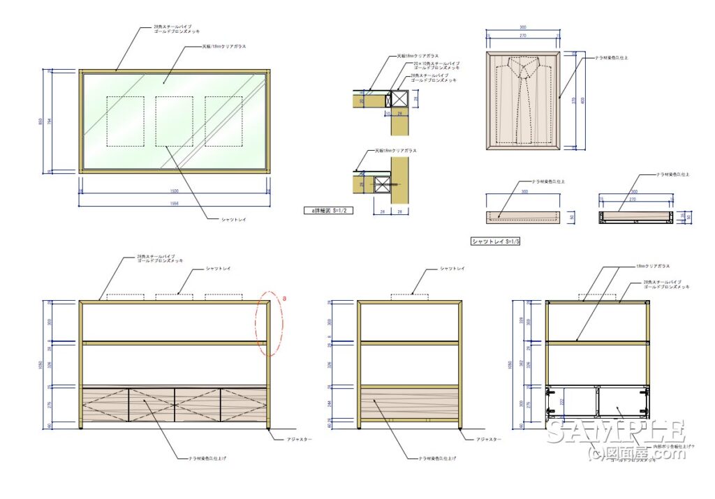 図面右上に詳細図と、什器トップに置くトレーが表現されてますが、ちょっとしたアイデアを感じます。